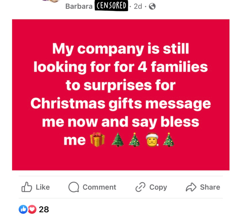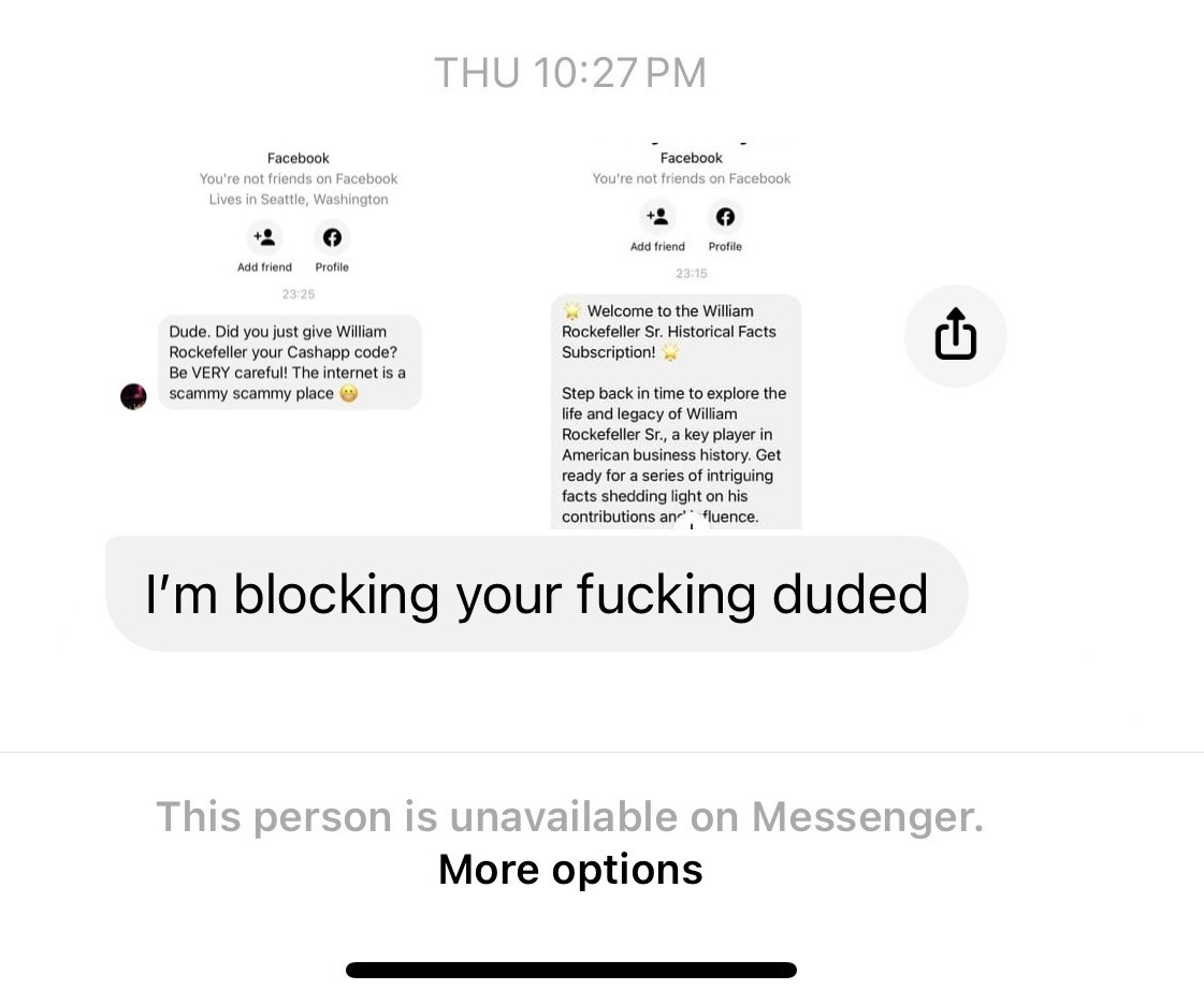 The chance at “gifts” if only you send a small amount on cash app first. Or perhaps, they will attempt to steal your profile so they can contact your friends as you and continue to find victims. Victims who in all likelihood are lacking the cognitive abilities required to recognize this as a scam. William Rockefeller Sr. would have been proud.