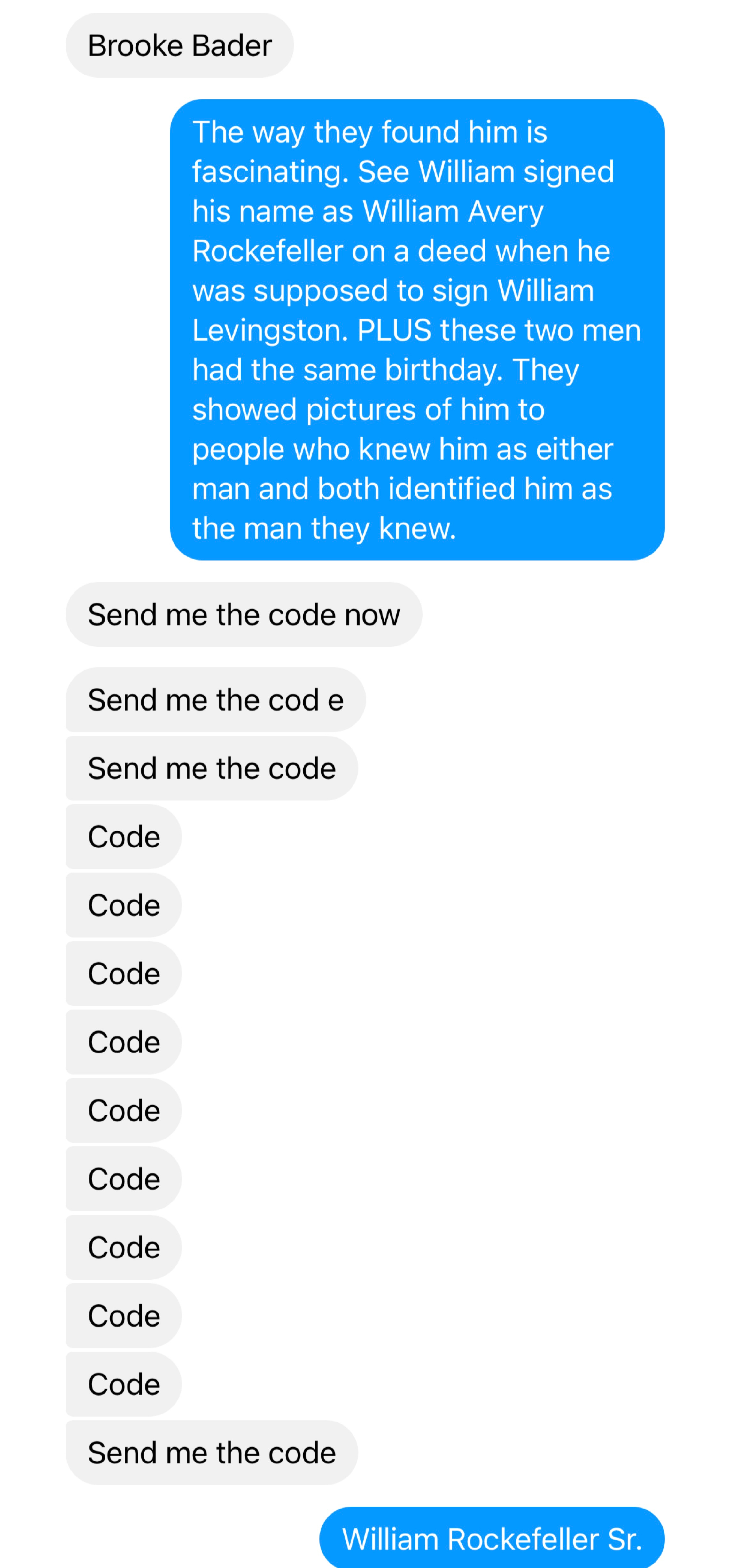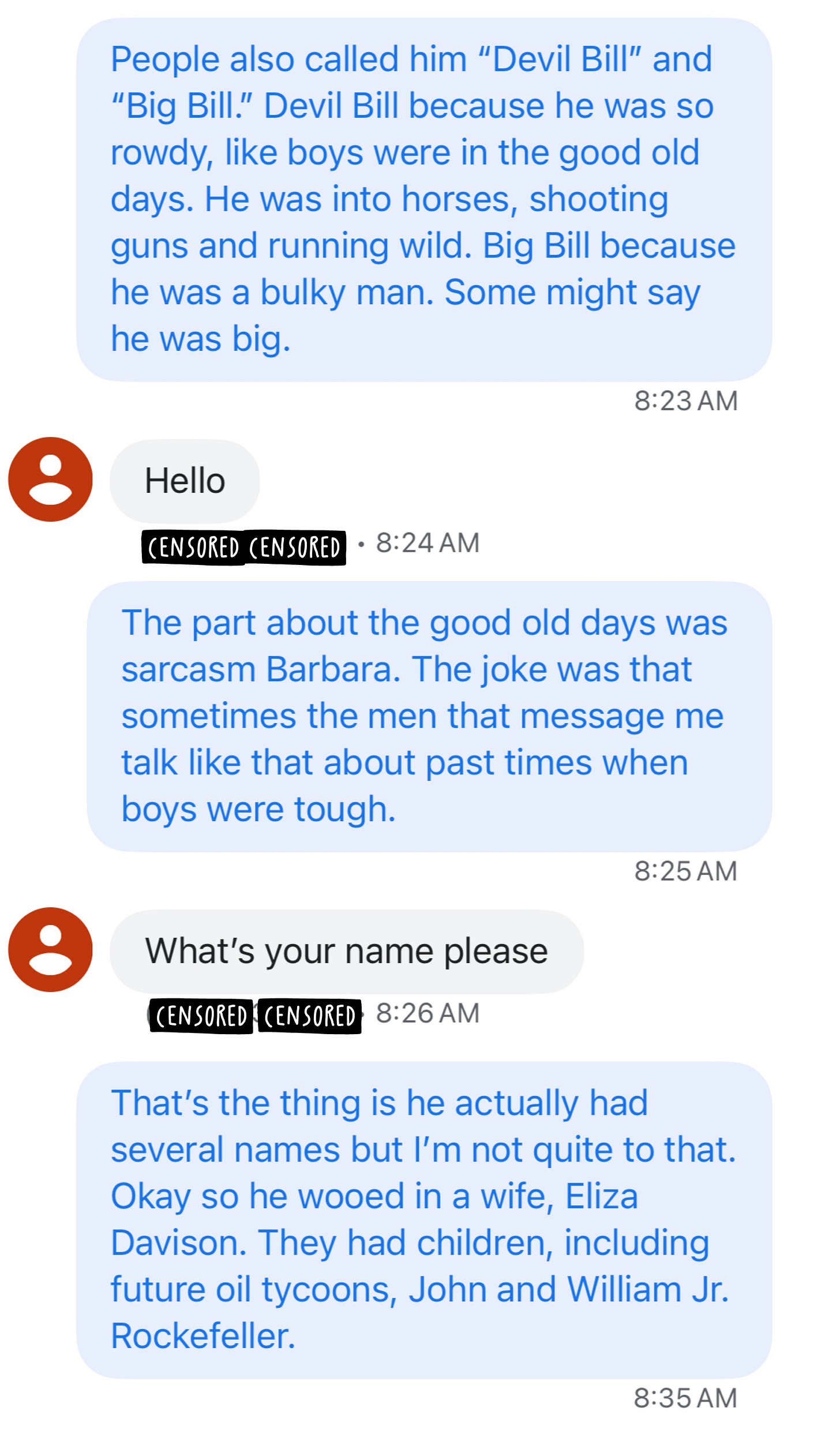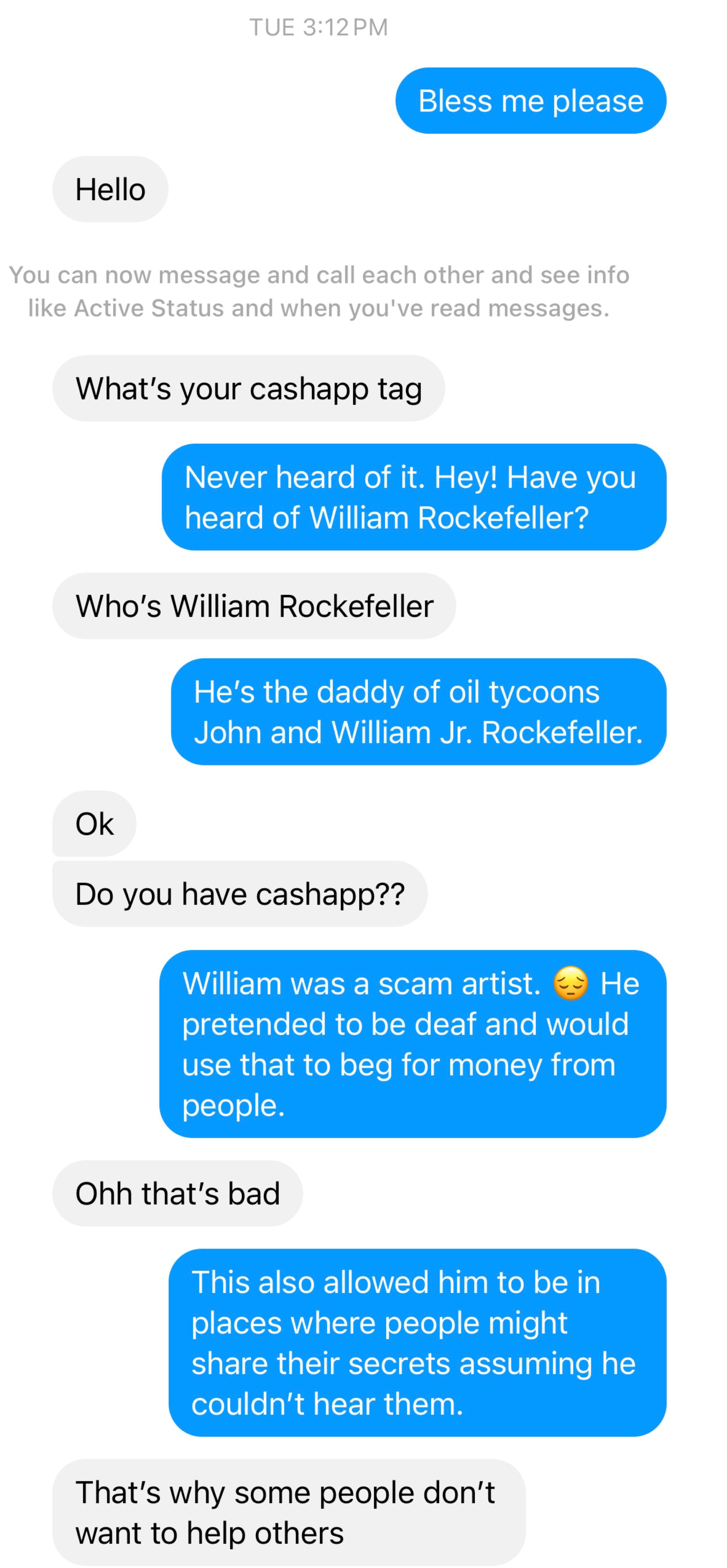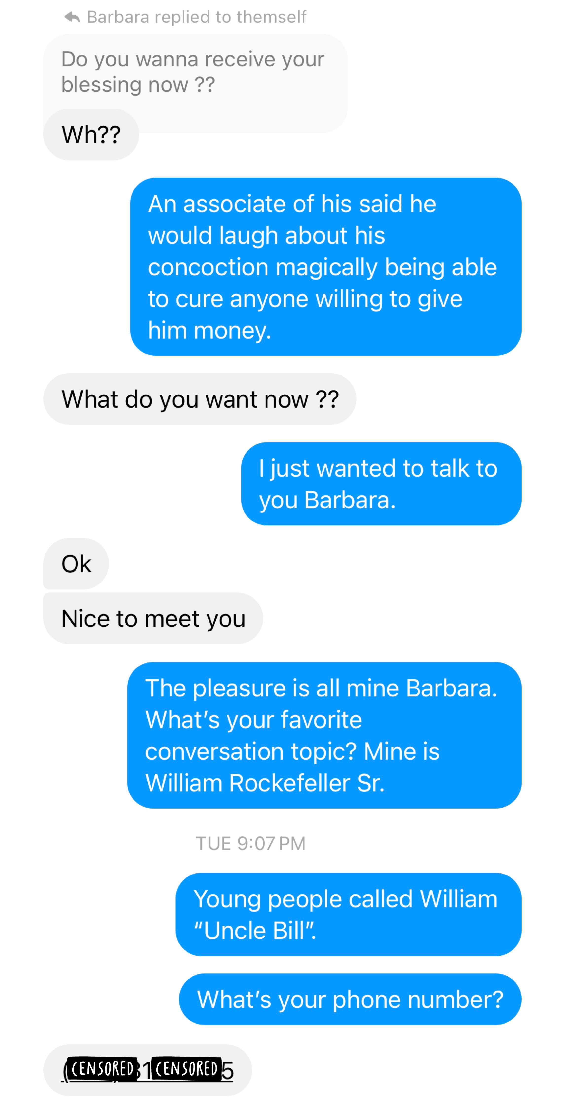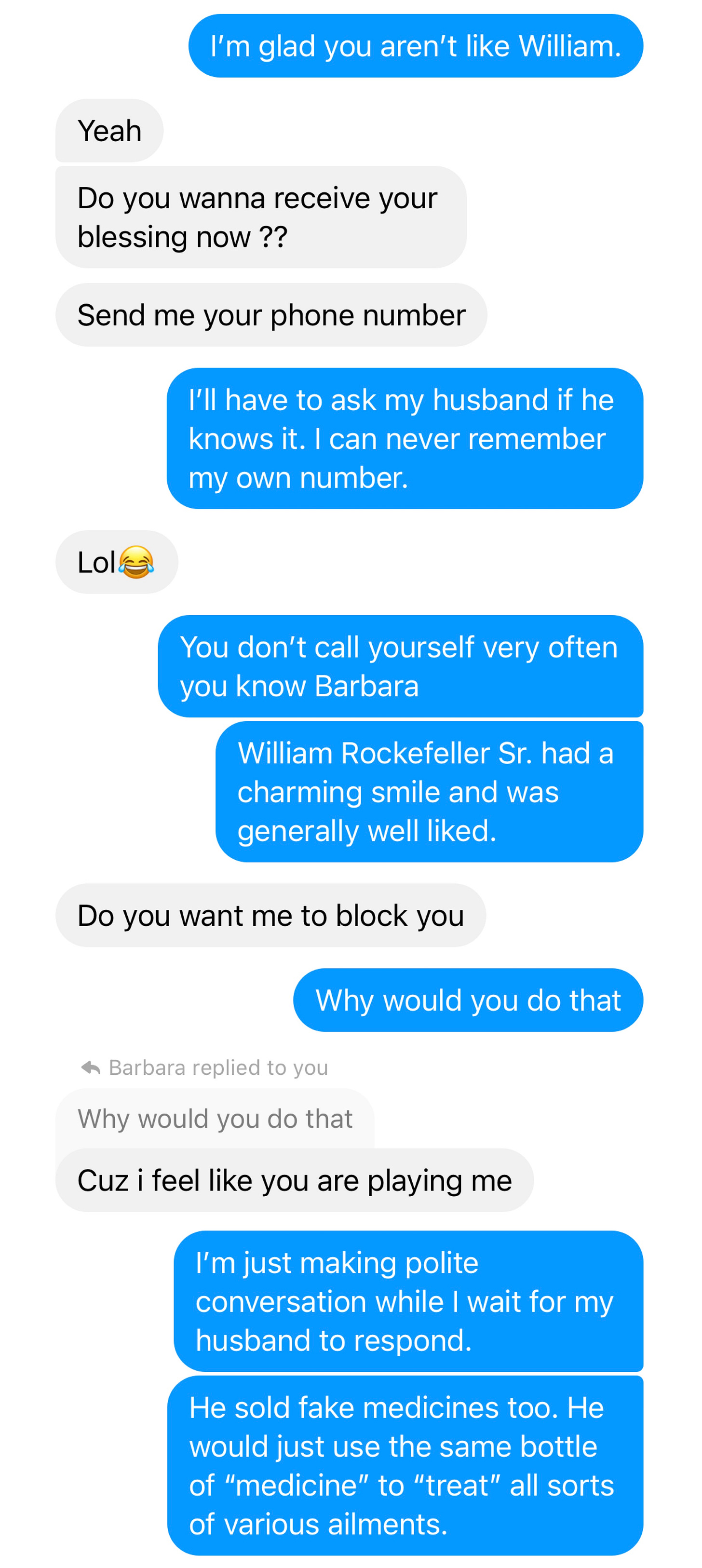 Barbara never got her code, but she did get more messages about William Rockefeller Sr. This post is originally from years ago. When I posted it on Facebook, her scam profile was still active and many people reached out to tell her more about old Willy. Barbara loved that.