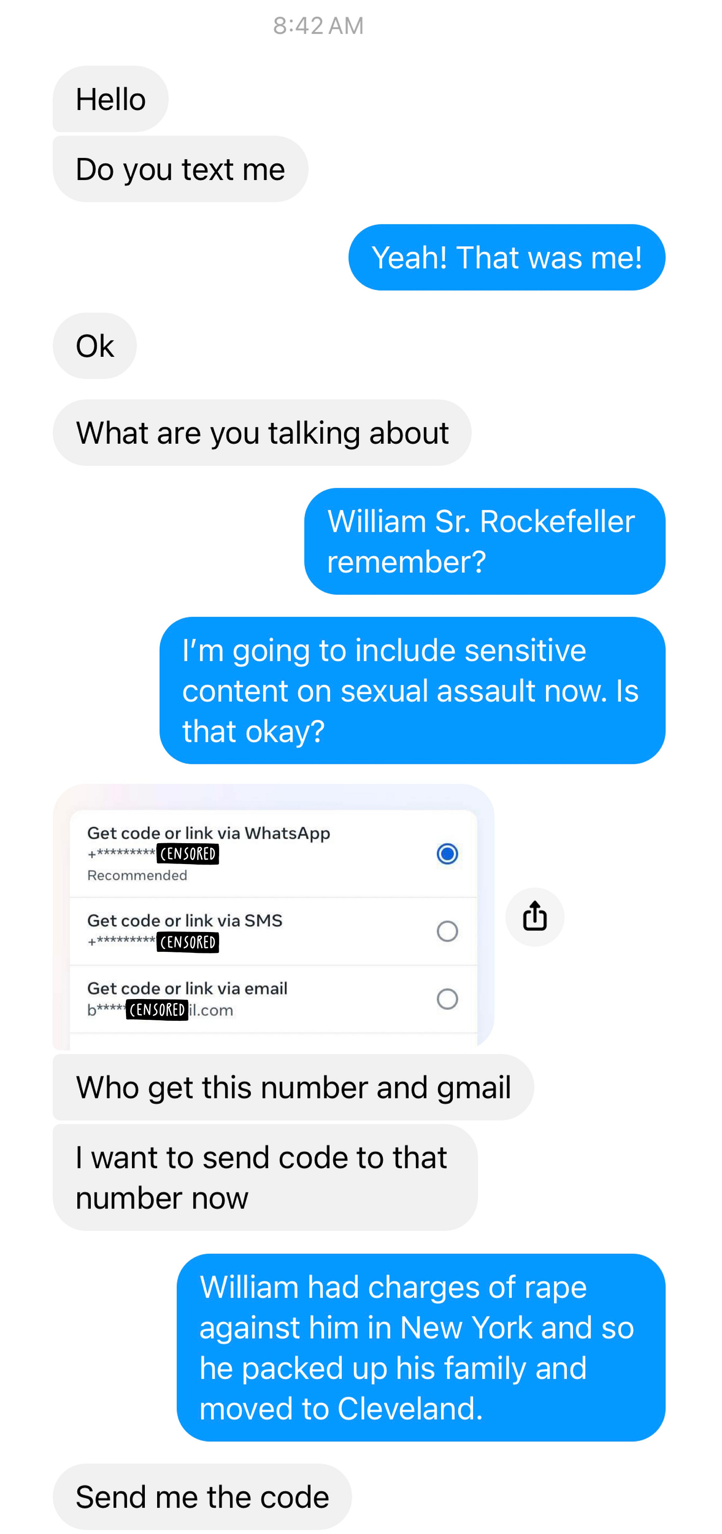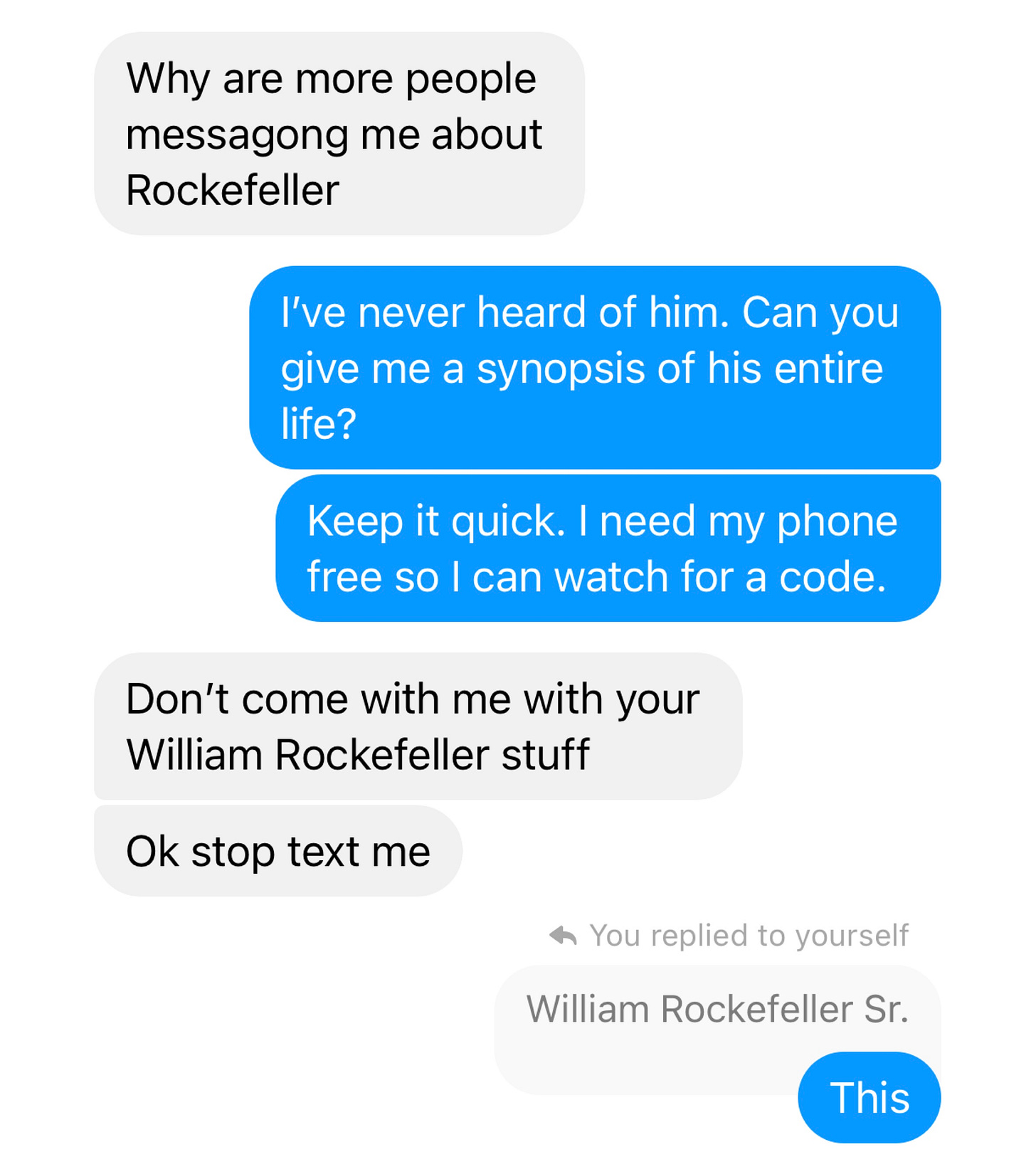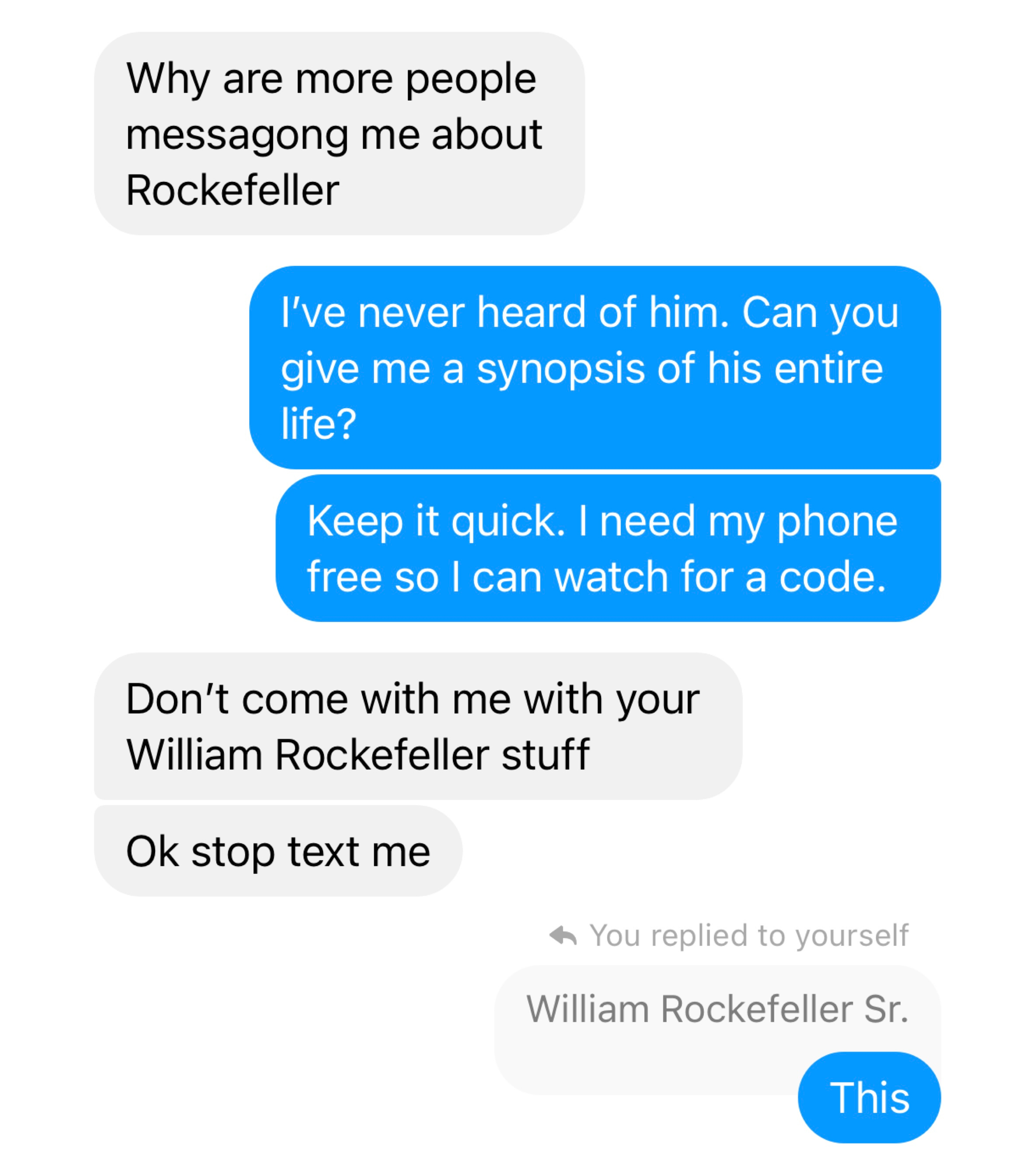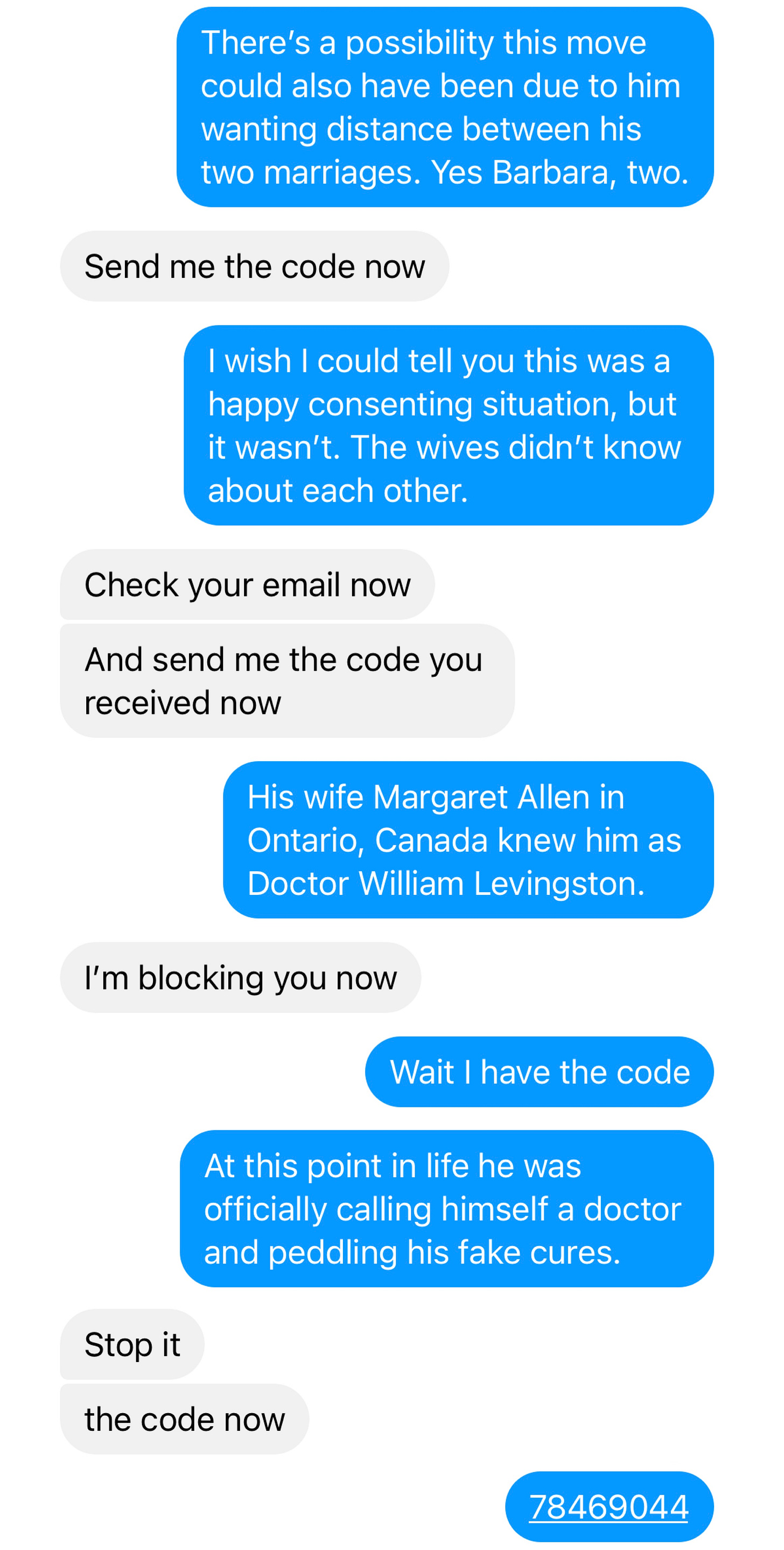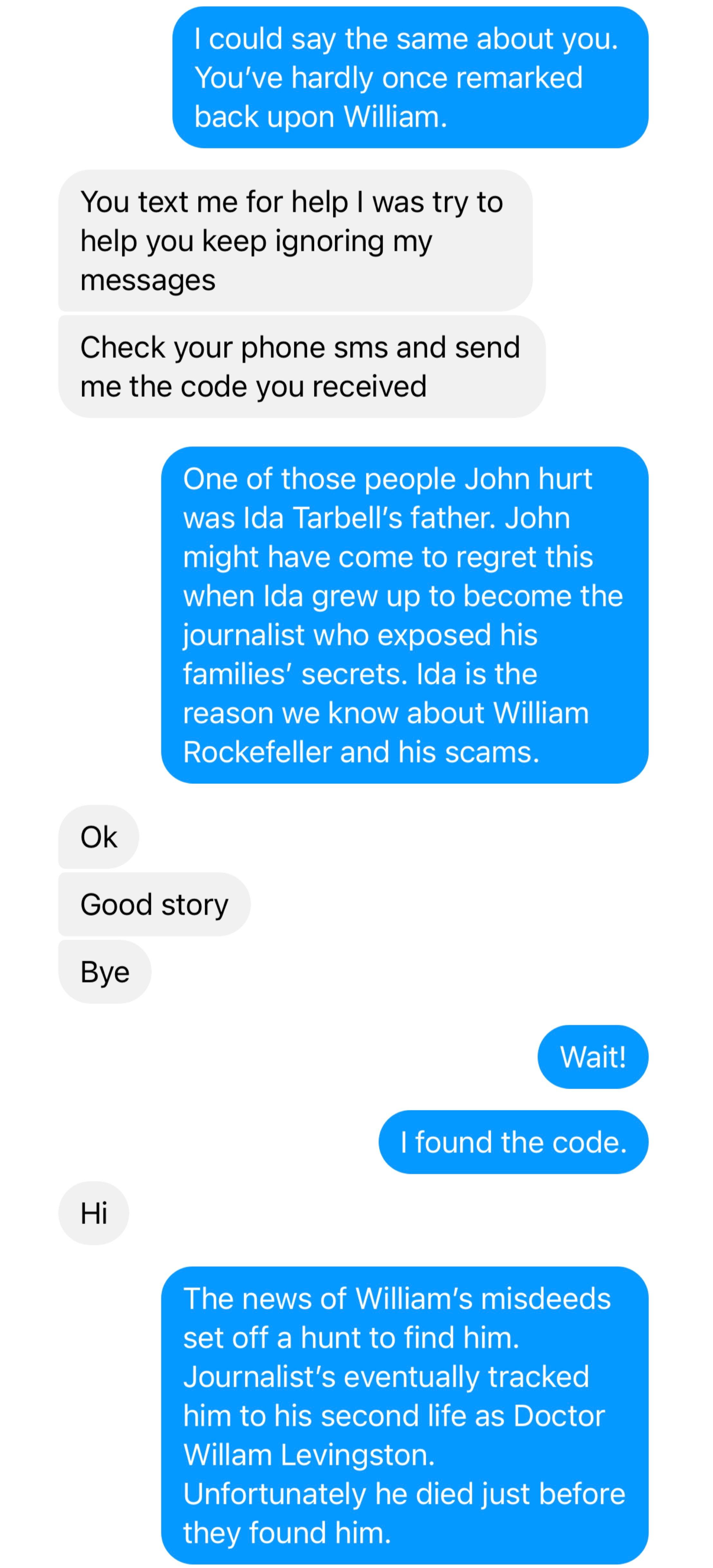 Barbara never got her code, but she did get more messages about William Rockefeller Sr. This post is originally from years ago. When I posted it on Facebook, her scam profile was still active and many people reached out to tell her more about old Willy. Barbara loved that.