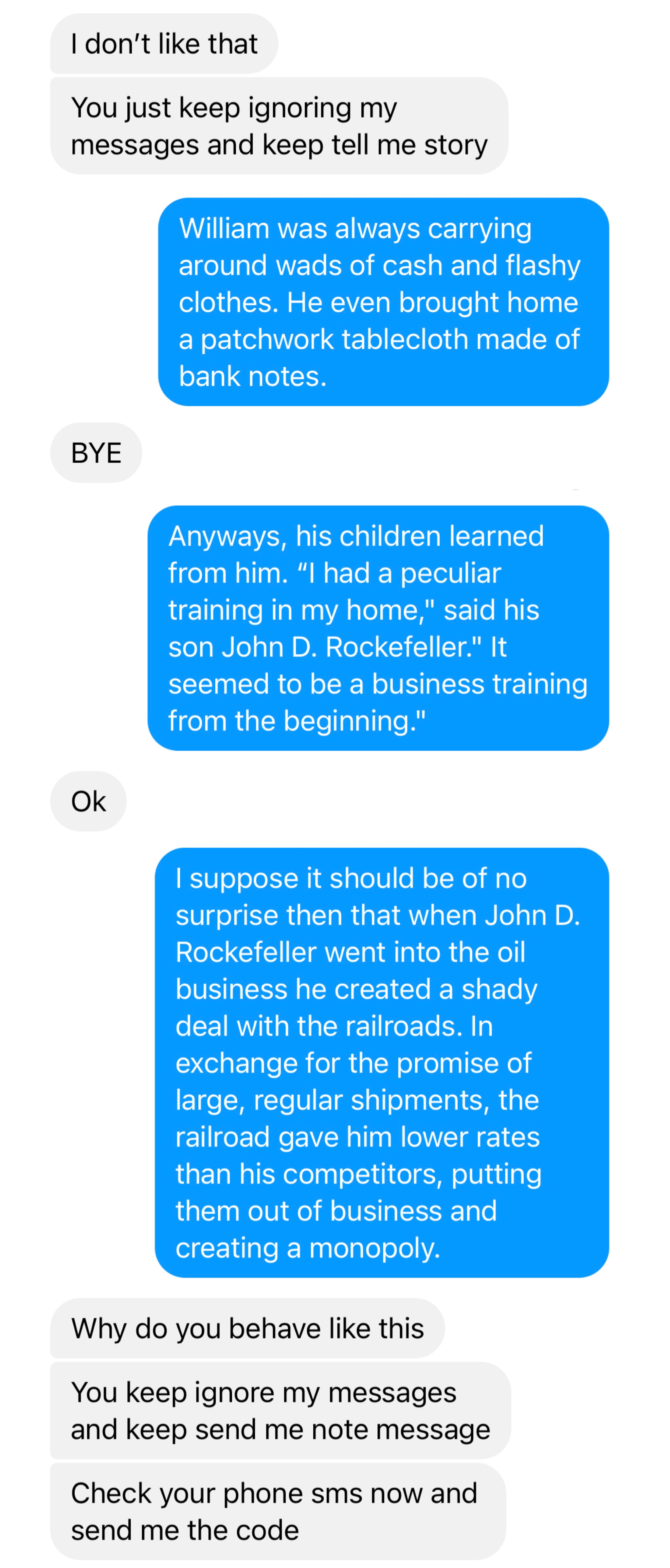 I love how they always have the nerve to ask why we are acting this way when they try to scam us. I'm an artist and I've gotten so sick of the scammers messaging me that one time, I decided to have a little fun. This guy wanted to buy rights to my art as NFTs. The funniest part is that one of the ones he chose was unfinished. Anyway, I started asking him to pay me in pennies. After awhile, he's like "Why are you doing this to me?" Seriously? Like William Rockefeller Sr, they have no conscience.