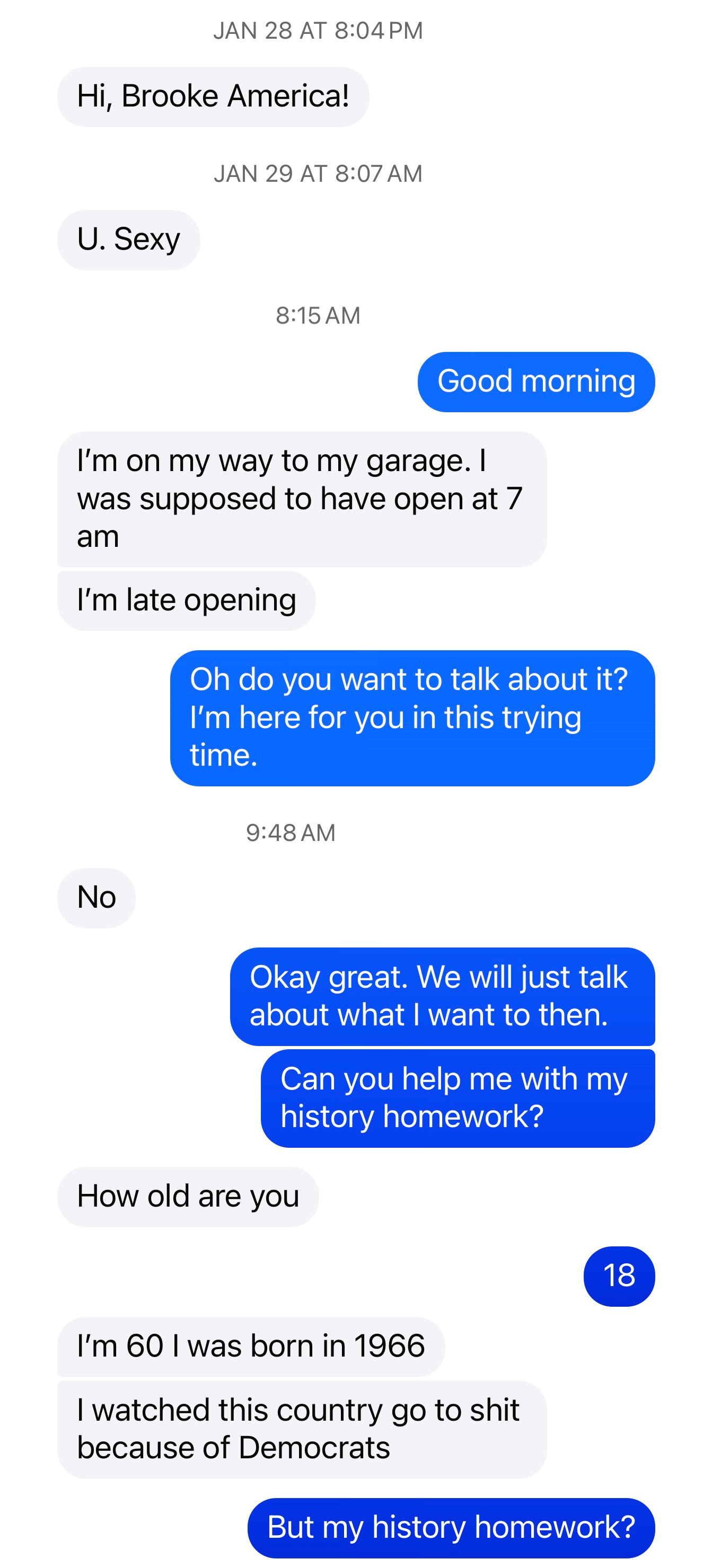 New here? Make America Learn History Again features real messages from right-wing men who respond to my satirical conservative character Brooke America. Find out more about me here.
